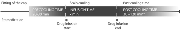 - The scalp is cooled by circulating a coolant through the cooling cap with independently controlled cooling sections. The system facilitates a reduction of the scalp temperature during the chemotherapy treatment period and maintains a controlled constant epicutaneous scalp temperature of +5 degrees C during the entire treatment period.